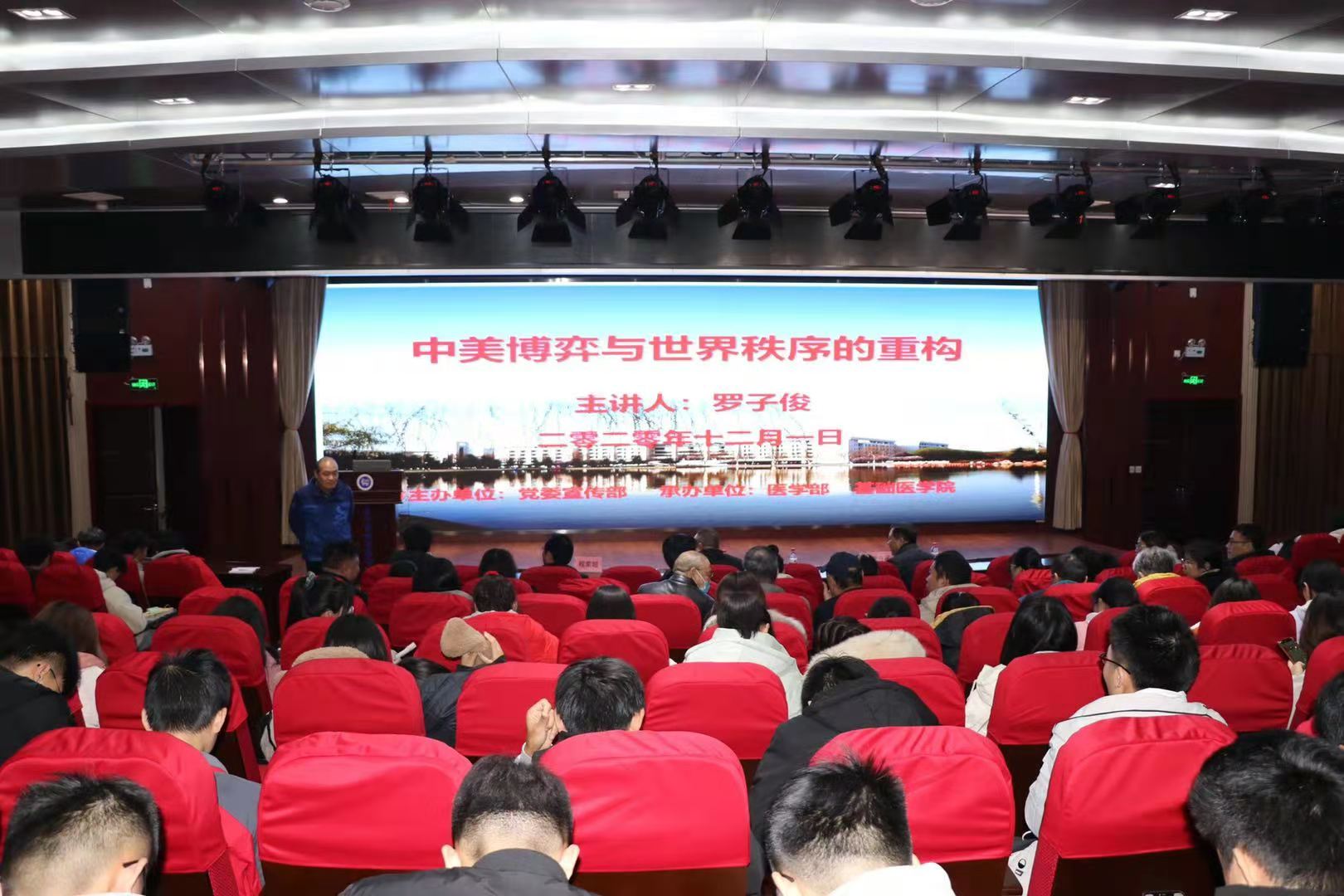 2020年12月1日下午16:00,医学部与基础医学院联合,在开元校区医科1号楼2楼教师发展中心举办了《中美博弈与世界秩序的重构》专题讲座。本次讲座由人文学院院长罗子俊主讲,医学部党委专职副书记贺志勇主持,医学部及基础医学院师生代表参加了此次学习。