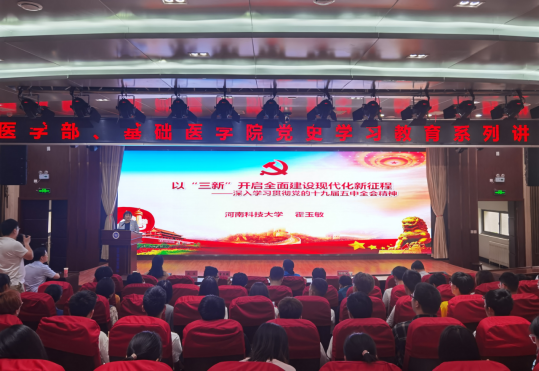 5月25日下午,医学部与基础医学院在医科1号楼医学教师发展中心联合举办理论讲堂之党的十九届五中全会精神专题讲座----《以“三新”开启全面建设现代化新征程》。此次讲座由河南科技大学马克思主义学院副教授霍玉敏主讲,医学部党委书记兼主任雷方、医学部专职副主任席守民、基础医学院党委书记程荣超以及医学部、基础医学院师生代表参加讲座,医学部党委专职副书记贺志勇主持会议。