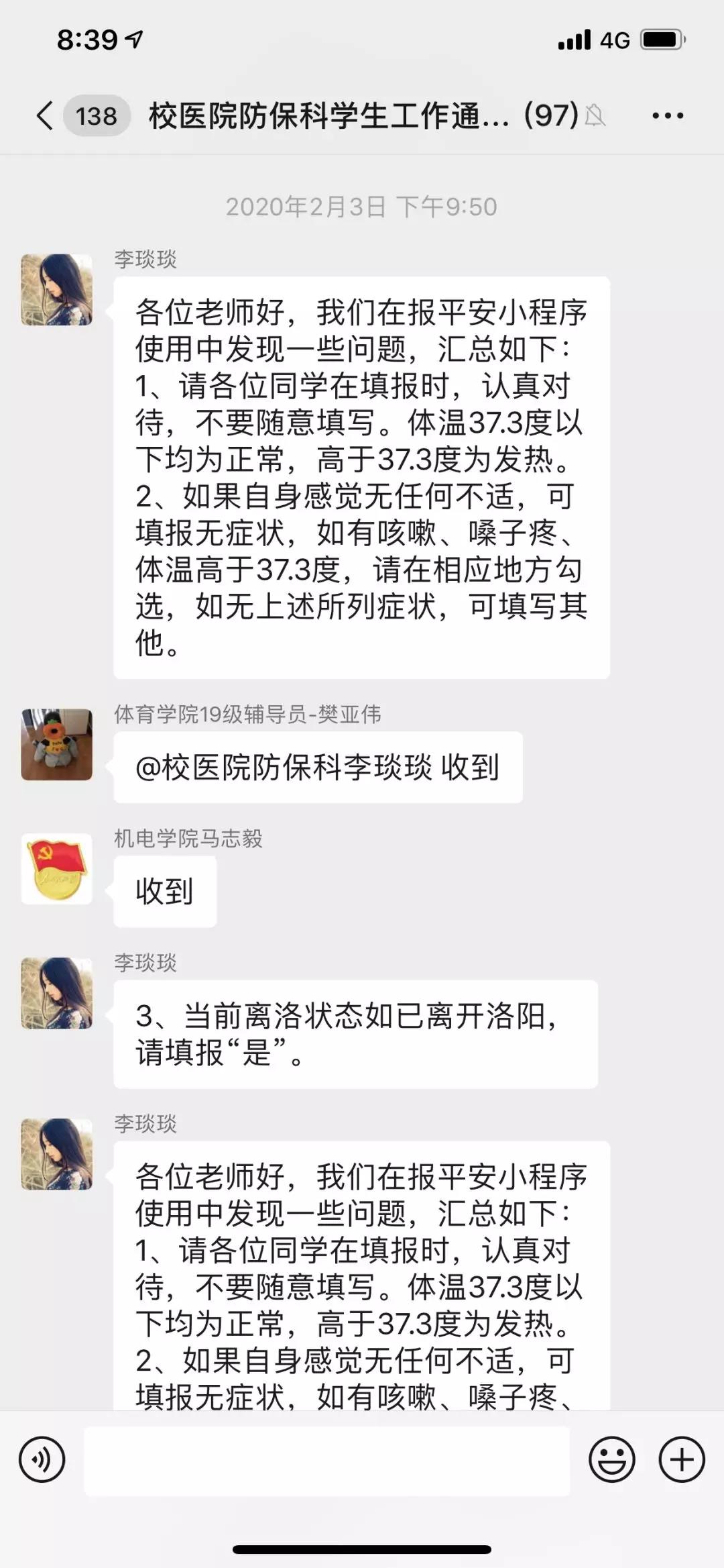 我校现有职工四千余人,各类学生四万余人,学生生源遍布全国。为确保安全信息及时上报,校医院紧急调配人员,开启24小时信息传达及学生信息及时上报机制,建立学校、院系、班级、辅导员四级防控工作联系网络,借助各学院力量对全校师生员工情况进行线上、线下调查摸排,特别是对我校教职工寒假期间离洛返洛情况进行排查,重点排查掌握往返疫情严重地区及其周边地区的人员情况,并指导其进行居家隔离、提供医学指导。