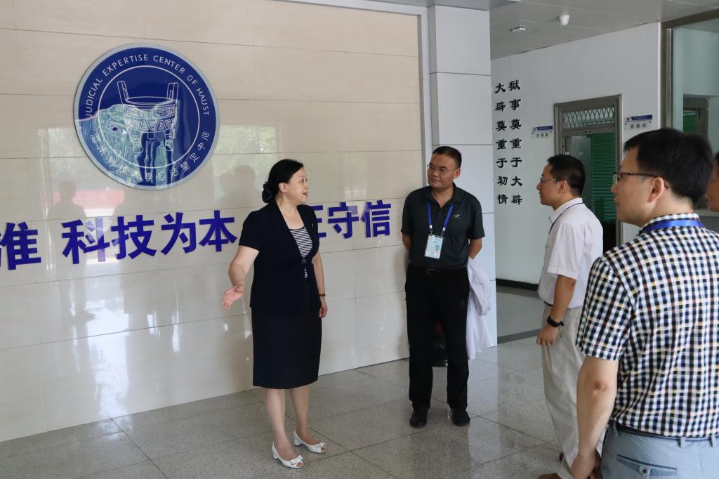 法医学院领导班子及司法鉴定中心负责人等对医学部的到访表示热烈欢迎。在司法鉴定中心主任莫耀南的带领下,医学部一行首先参观了司法鉴定中心的法医物证实验室、毒物分析实验室以及接待受理室等。随后,进行了座谈。在座谈会上,法医学院院长潘新民从教学科研、学科建设、人才培养、队伍建设、社会服务等方面介绍了法医学院的基本情况。莫耀南主任介绍了目前司法鉴定中心的发展现状、存在的问题和困难,重点介绍了司法鉴定中心为迎接河南省资质认证所做的各项准备工作,并表示加强组织领导,明确工作职责,强化工作安排,严肃工作要求,全力以赴确保司法鉴定的资质认证顺利通过。