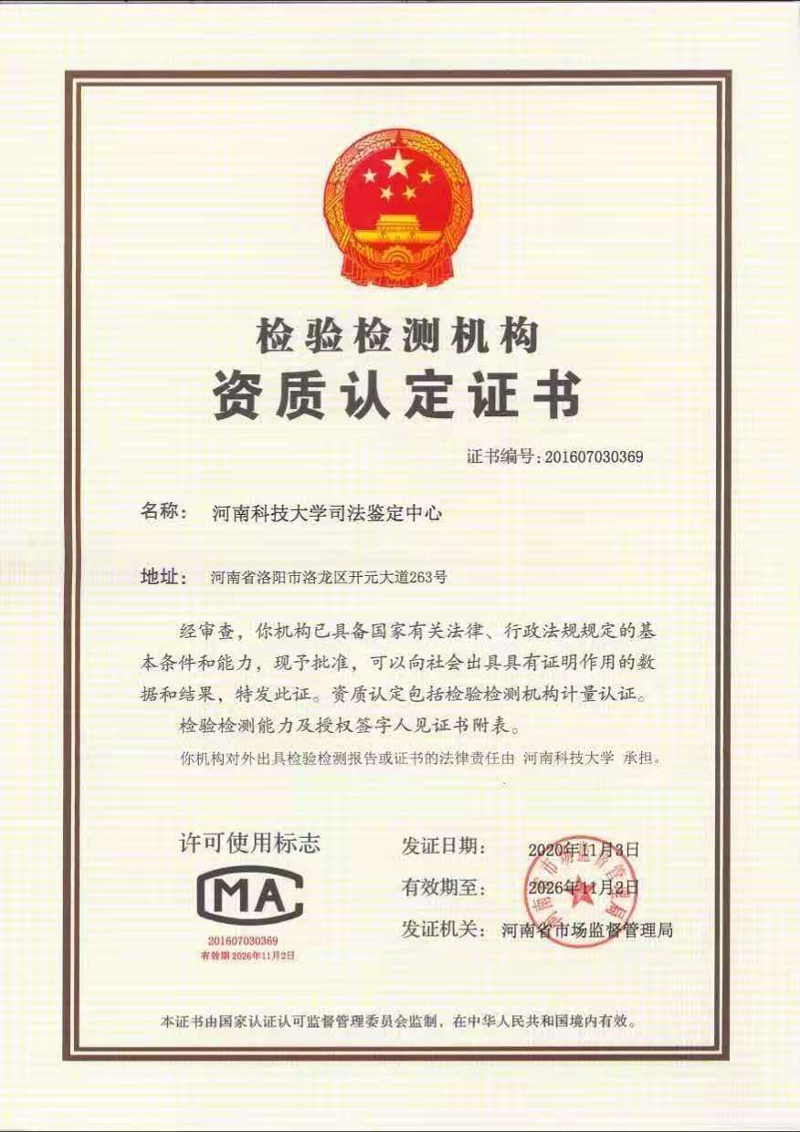 日前,我校司法鉴定中心通过河南省市场监督管理局的现场评审和文件评审,获得专家一致推荐,取得省级资质认定证书,证书有效期为6年。
