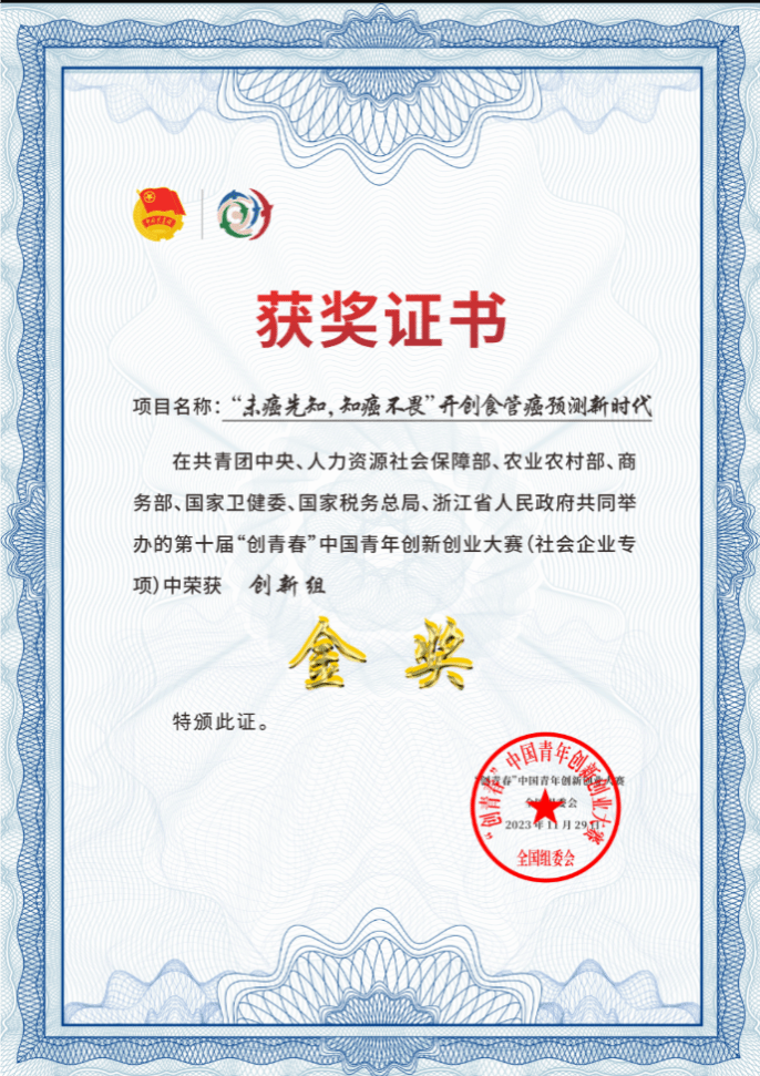本届大赛共有近3000个项目入围国赛网评阶段,经过激烈角逐,在指导专家高社干、曹高洋、赵莹、郝晓伟、许锋波和刘铎等老师的悉心指导下,我校一附院刘轲、张冉、卫新乐、金子灿参与的《“未癌先知,知癌不畏”开创食管癌预测新时代》项目荣获金奖。这是河南省在本次大赛中获得的唯一一枚金奖,也是全国卫生健康领域唯一获得金奖的团队。